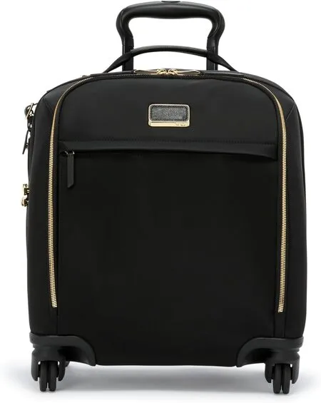 The Voyageur Léger (pronounced “lay-ZHAY”) is a premium mini suitcase. It’s a rigid 16″ tall spinner with four dual wheels, made of TUMI’s lightweight ballistic nylon. The interior opens flat and is divided by a zippered wall with compression straps. You’ll find multiple pockets for organization (including a padded laptop sleeve, zip pouches, and a clasp for your phone/keys). It also features TUMI’s built-in TSA combination lock and a TUMI Tracer tag (in case your bag is lost). Three-stage telescoping handle and leather-wrapped top/side handles make it easy to lift and pull. In essence, it’s a smaller version of a full carry-on suitcase, with extremely high build quality.