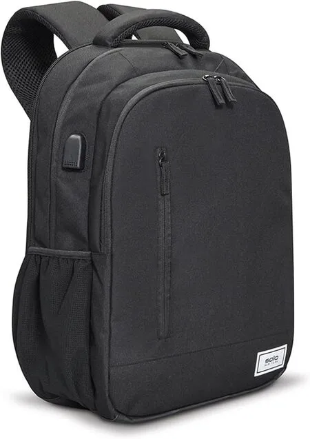The Solo Draft is a no-frills slim laptop backpack (about 12″×17.5″×5.5″). It has one main compartment (with padded sleeve for up to a 15.6″ laptop) and a small front zip pocket. Two side mesh pockets hold water bottles. At around 1.5 lb empty, it’s quite lightweight. The straps are modestly padded.
